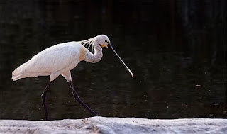 Spoonbill : Spoonbills are a group of large, long-legged wading birds in the family Threskiornithidae, which also includes the Ibises. All have large, flat, spatulate bills and feed by wading through shallow water, sweeping the partly-opened bill from side to side. The moment any small aquatic creature touches the inside of the bill—an insect,crustacean, or tiny fish—it is snapped shut.